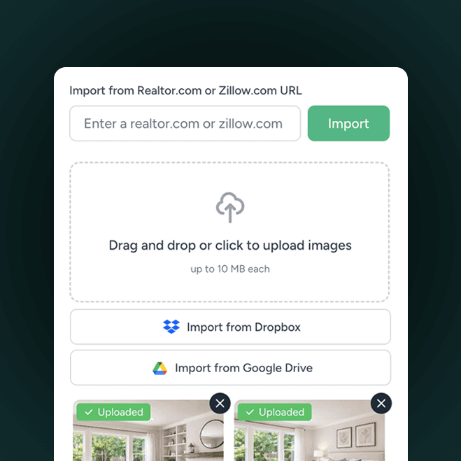 Connect Dropbox, Google Drive, Zillow, or Realtor.com — or simply drag and drop your images directly.
